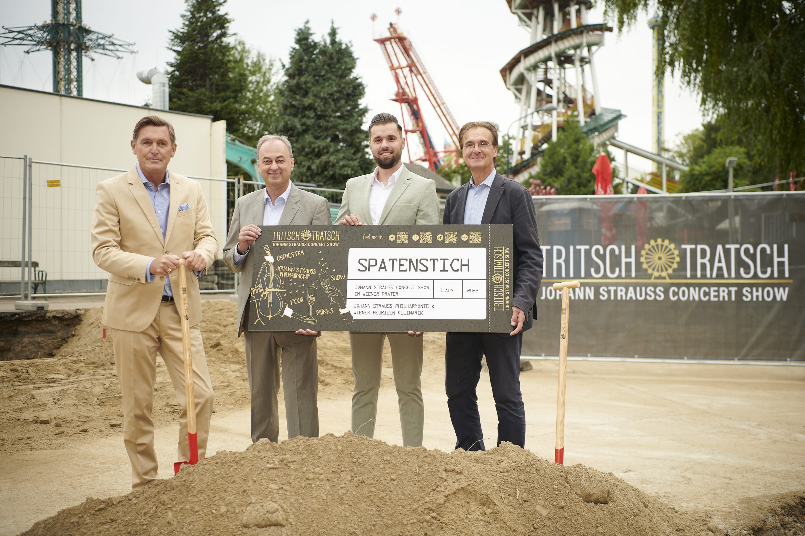 Neues Gala-Spiegelzelt bietet ab Oktober ganzjährig Johann Strauss-Konzertshows im Wiener Prater – Spatenstich durch Stadtrat Hanke, Johann Strauss-Kurator Geyer, Prater-Chef Prohaska und Tritsch-Tratsch Director Grünbacher…